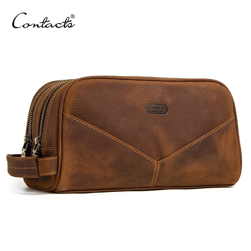 صور من CONTACT'S حقيقية حقيبة منتجات تجميل جلدية للرجال خمر مجنون الحصان الجلود رجل تشكل أكياس صغيرة السفر أكياس الذكور حقيبة مستحضرات تجميل